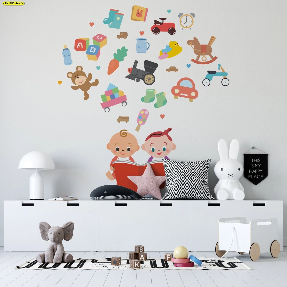 วอลเปเปอร์ลายการ์ตูนเด็กสองคนกำลังอ่านหนังสือร่วมกันบนพื้นหลังสีขาวนวลพร้อมของเล่นลอยฟ้าหลากสีสรรเป็นไอเดียที่ยอดเยี่ยมสำหรับครูอนุบาลที่ต้องการสร้างบรรยากาศห้องเรียนที่อบอุ่นและส่งเสริมการอ่าน องค์ประกอบของภาพประกอบด้วยหมีตุ๊กตา บล็อกไม้ ABC รถของเล่น ม้าไม้โยก ขวดนม แครอท และนาฬิกาปลุก ที่จะช่วยกระตุ้นจินตนาการและความอยากรู้อยากเห็นของเด็กปฐมวัย ภาพติดผนังดีไซน์นี้เหมาะสำหรับโรงเรียนเอกชนที่ต้องการจัดมุมอ่านหนังสือหรือพื้นที่กิจกรรมกลุ่มให้เด็กๆ รู้สึกสนุกสนานและอยากเข้าร่วมกิจกรรม ด้วยโทนสีพาสเทลที่นุ่มนวลไม่ฉูดฉาดจึงช่วยให้เด็กเล็กรู้สึกผ่อนคลายและมีสมาธิในการเรียนรู้ได้ดีขึ้น