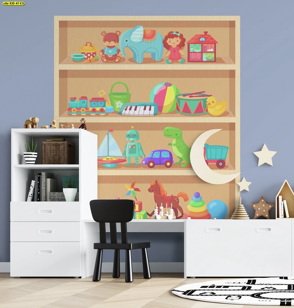 วอลเปเปอร์ลายการ์ตูน ตกแต่งมุมเล่น แต่งห้องเรียนเด็กลายชั้นวางของเล่นสีไม้แนวการ์ตูนน่ารัก โทนสีพาสเทลน่ารัก