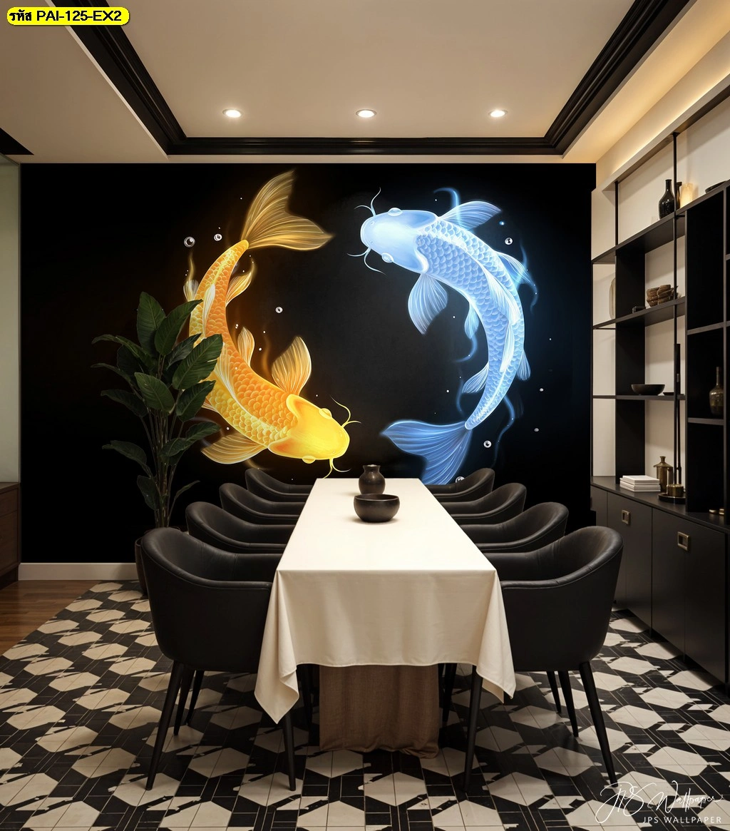 ห้องรับประทานอาหารสไตล์โมเดิร์นโทนขาวดำ ใช้วอลเปเปอร์ปลาคาร์ฟแต่งห้องรับแขกปลาคาร์ฟคู่บนพื้นหลังดำด้านหลังโต๊ะยาว ช่วยสร้างบรรยากาศหรูสำหรับรับรองแขกและลูกค้า เหมาะกับโฮมออฟฟิศและร้านอาหารฟีลลักชัวรี