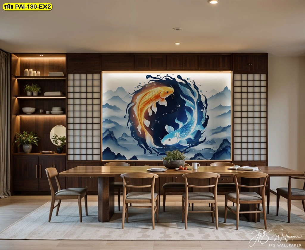 ห้องรับประทานอาหารไม้บิลต์อินสไตล์โมเดิร์นญี่ปุ่น ใช้วอลเปเปอร์ปลาคาร์ฟศิลปะจีนแต่งผนังบ้านลายปลาคาร์ฟคู่กึ่งหยินหยาง ตัดกับชั้นไม้และบานเลื่อนกระจก ช่วยให้พื้นที่กินข้าวกลายเป็นมุมหรูเหมือนร้านอาหารระดับโรงแรม