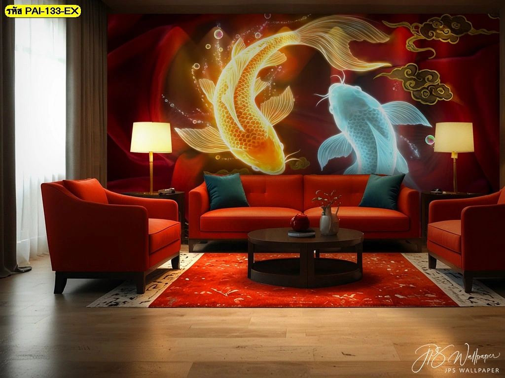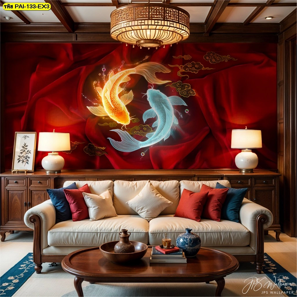 วอลเปเปอร์ปลาคาร์ฟแต่งห้องรับแขก พื้นหลังผ้าไหมสีแดง ปลาคาร์ฟคู่ทองฟ้าอยู่เหนือโซฟาสีครีม ช่วยให้ห้องดูหรูมงคล เหมาะสำหรับเจ้าของบ้านและคอนโดที่ต้องการจุดเด่นบนผนัง
