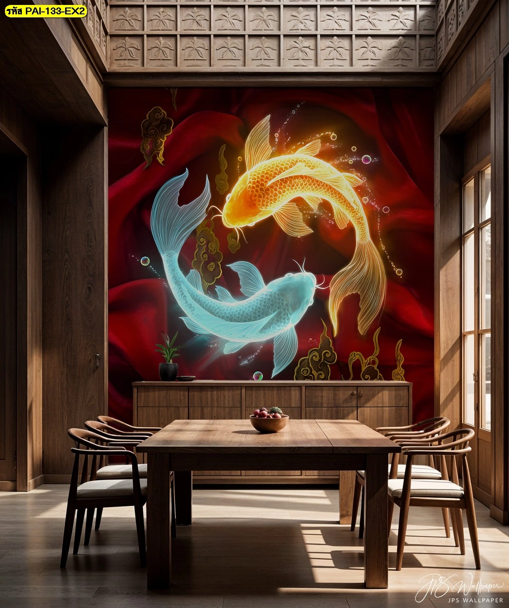 ภาพจำลองห้องรับประทานอาหารสไตล์ไม้ธรรมชาติ ใช้วอลเปเปอร์ปลาคาร์ฟแต่งห้องรับแขกปลาคาร์ฟทองและฟ้าตัดพื้นหลังแดง สร้างบรรยากาศหรูและอบอุ่น เหมาะสำหรับบ้านหรูและร้านอาหารพรีเมียม