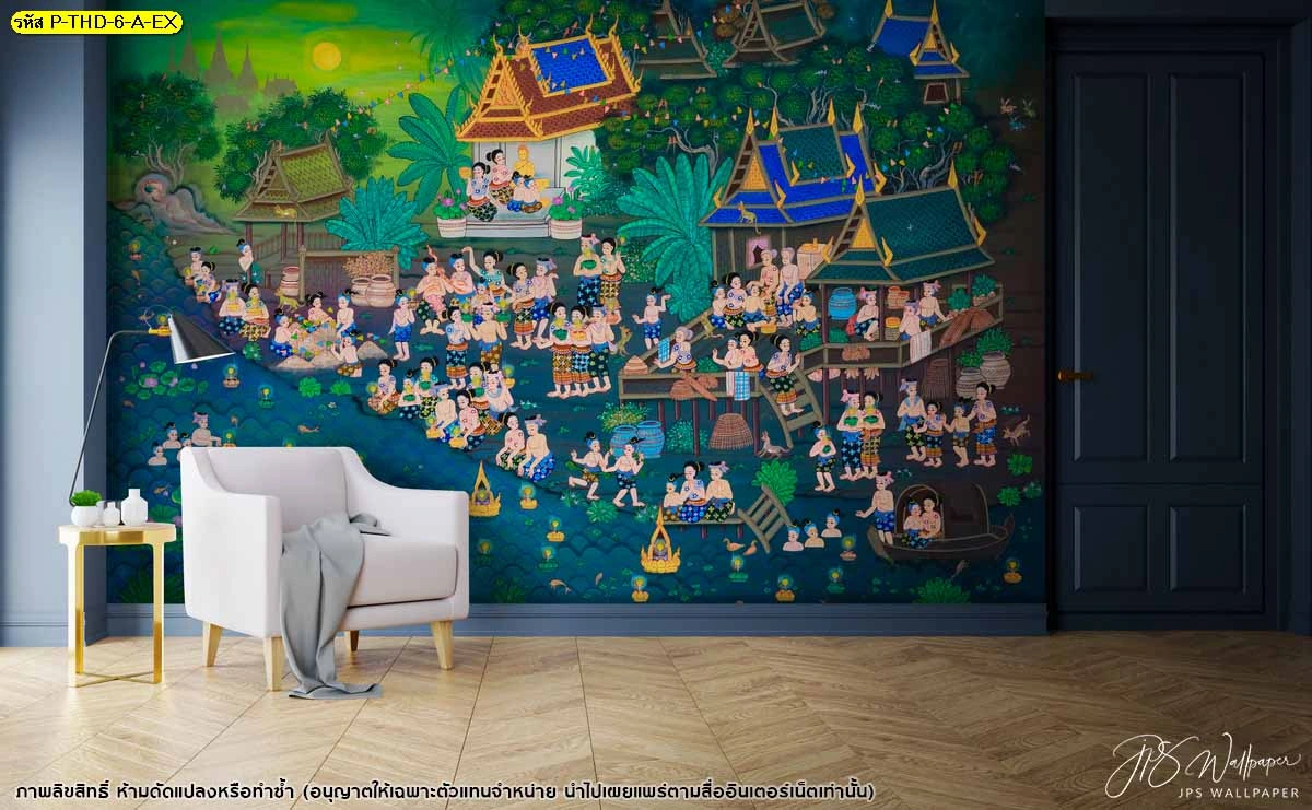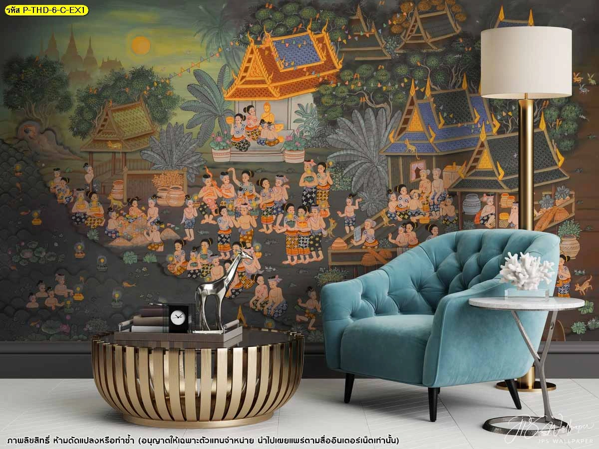 วอลเปเปอร์ประเพณีลอยกระทง ตกแต่งผนังห้องนั่งเล่นคู่กับอาร์มแชร์ เพิ่มความหรูหราด้วยศิลปะไทยร่วมสมัย