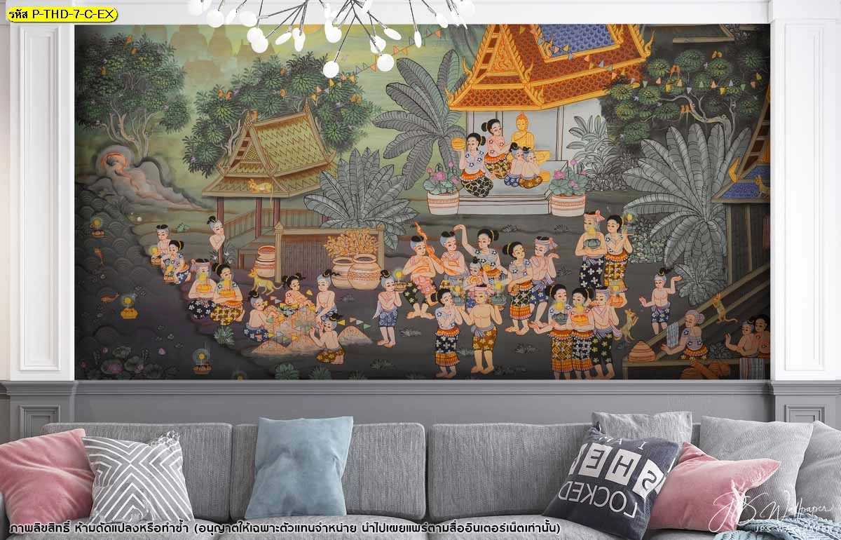 ตกแต่งผนังหลังโซฟาด้วยภาพวาดศิลปะไทยตกแต่งผนังห้อง สร้างจุดโฟกัสสายตาที่สื่อถึงความเจริญรุ่งเรืองและวัฒนธรรมไทย