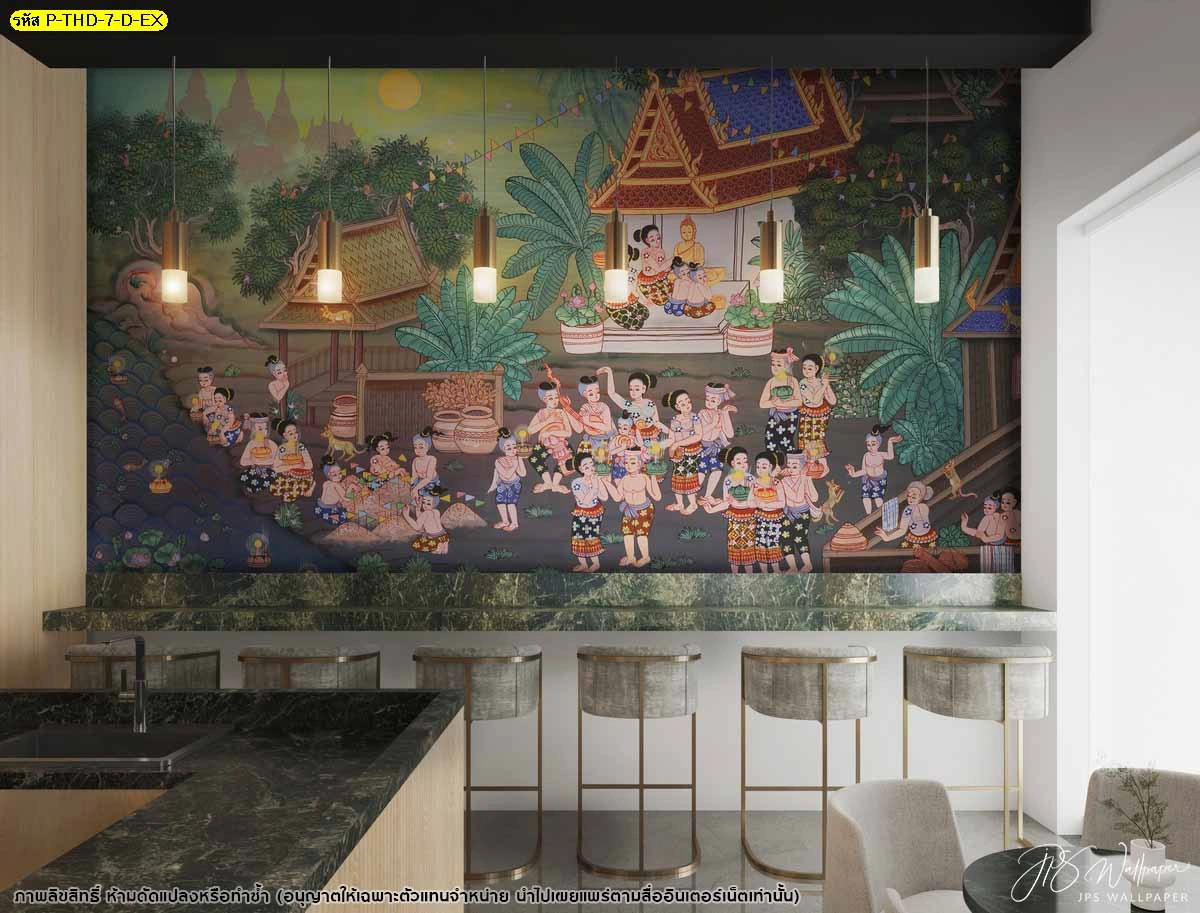 การวางแผนสัดส่วนอย่างรัดกุมทำให้ภาพจิตรกรรมไม่ถูกตัดขาดหรือเสียความสมดุล ช่วยถ่ายทอดเรื่องราวของประเพณีไทยได้อย่างครบถ้วน สื่อถึงความร่มเย็นเป็นสุข สร้างจุดศูนย์กลางสายตาที่ทรงพลัง เปี่ยมไปด้วยมนต์ขลัง สอดคล้องกับหลักสถาปัตยกรรมร่วมสมัย มอบคุณค่าทางสุนทรียภาพที่ประเมินค่าไม่ได้ให้กับผู้อยู่อาศัย อาจพิจารณาวอลเปเปอร์ลายประเพณีสงกรานต์เพื่อเพิ่มความหลากหลายของธีมเทศกาลไทยได้อีก