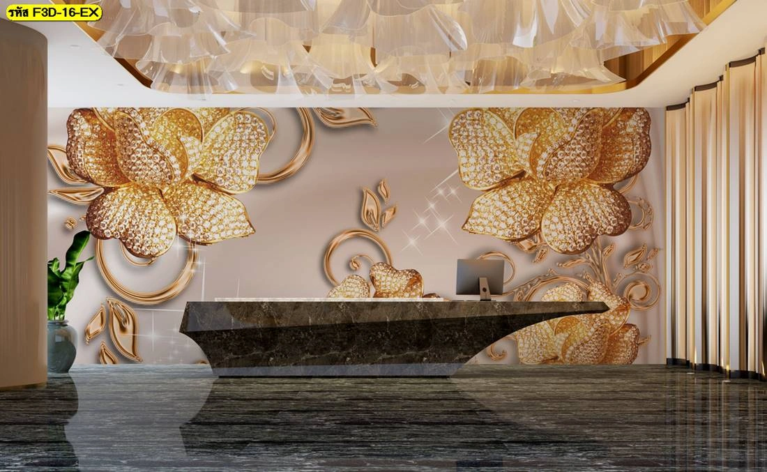ภาพวอลเปเปอร์ 3D ดอกไม้สีทองหรูหรา ตกแต่งล็อบบี้โรงแรม เพิ่มความประทับใจให้ธุรกิจด้วยงานศิลปะตกแต่งผนังสวยงามระดับพรีเมียม