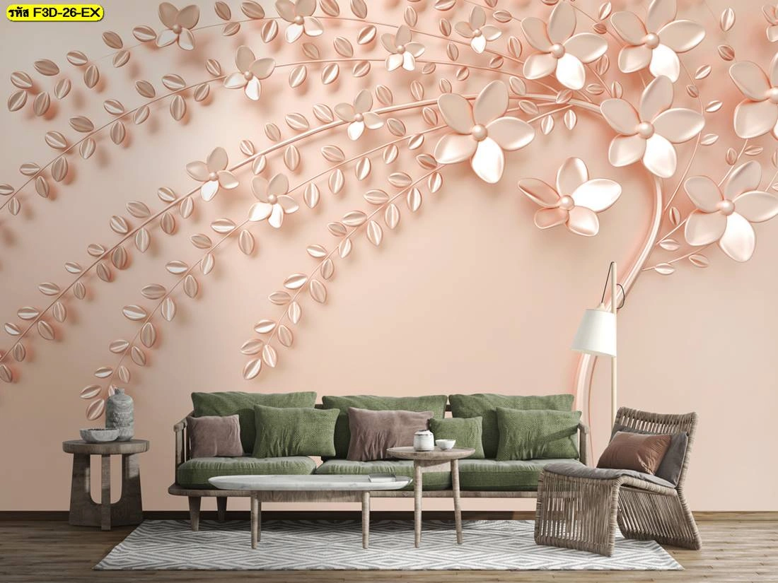 วอลเปเปอร์ดอกไม้หรูสามมิติ สีโรสโกลด์ สไตล์โมเดิร์นหวานละมุน เหมาะกับการตกแต่งห้องนั่งเล่นและมุมพักผ่อนให้รู้สึกอบอุ่นละมุนตา