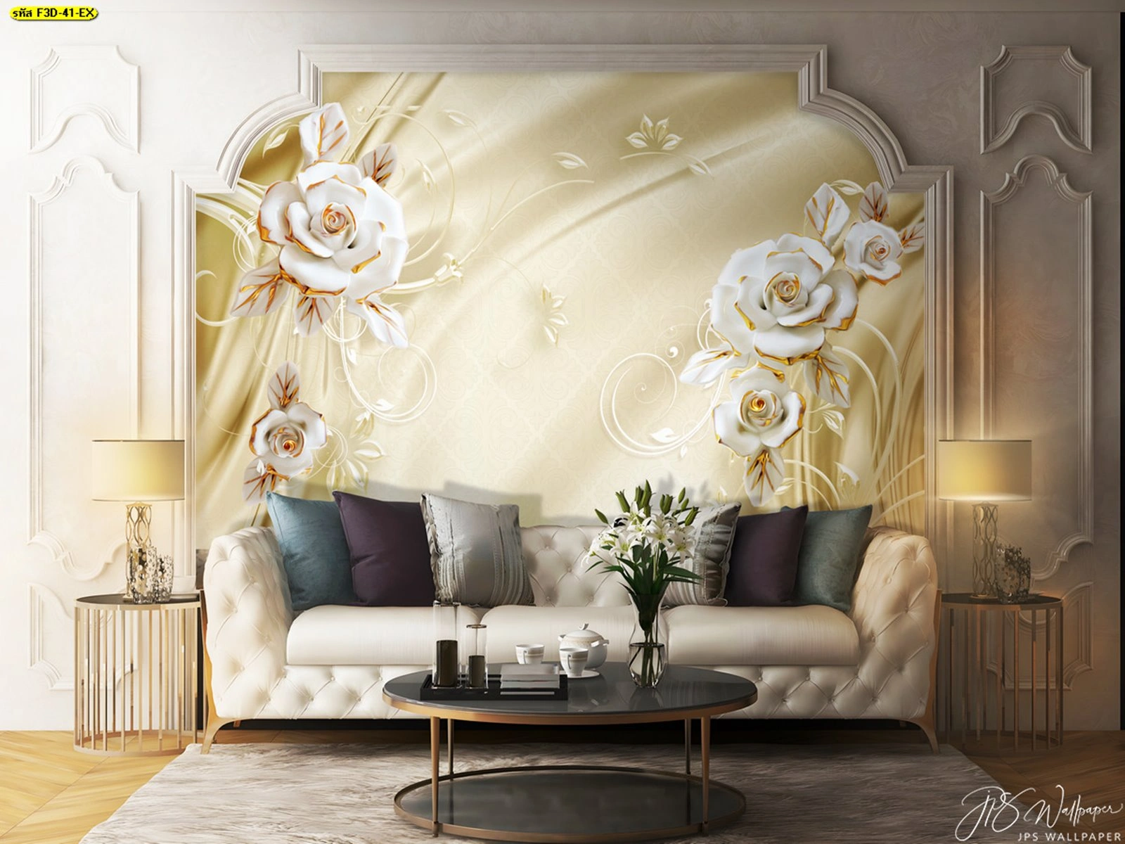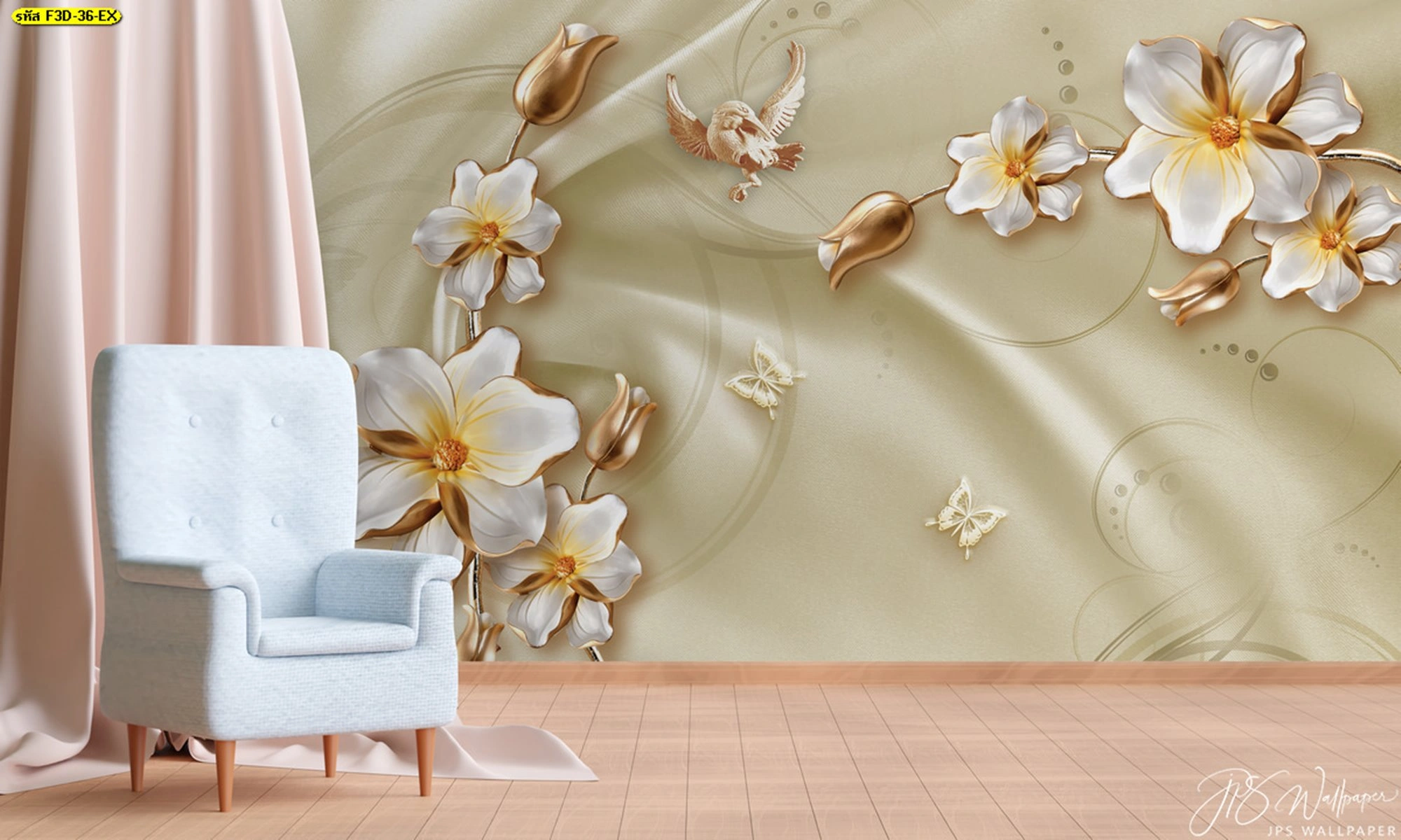 วอลเปเปอร์ดอกไม้หรูสามมิติ สีทองสดใส เน้นดีไซน์ลายดอกไม้หรูสร้างบรรยากาศผ่อนคลาย เหมาะสำหรับแต่งผนังห้องรับแขกและพื้นที่พักผ่อนในบ้านทันสมัย