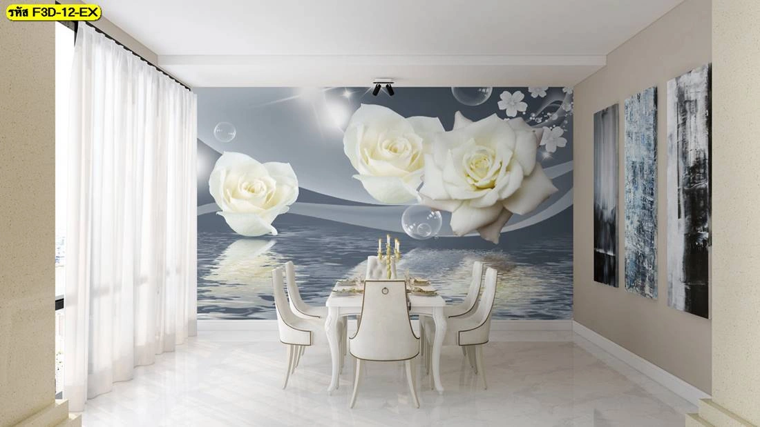 วอลเปเปอร์ดอกกุหลาบสีขาวลอยเหนือผิวน้ำโทนเทาเงิน แต่งผนังมุมโต๊ะกินข้าวให้ดูลึกและโปร่งมากขึ้น เหมาะกับห้องรับประทานอาหารของบ้านและคอนโดที่อยากได้สไตล์หรูสงบแบบร่วมสมัย