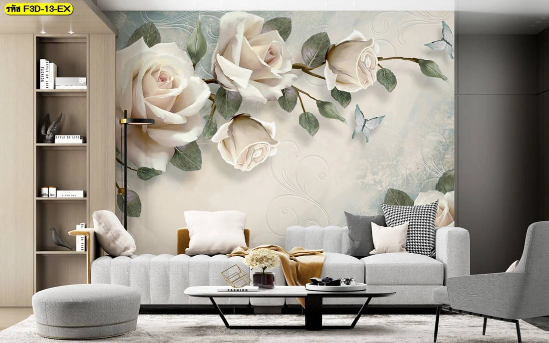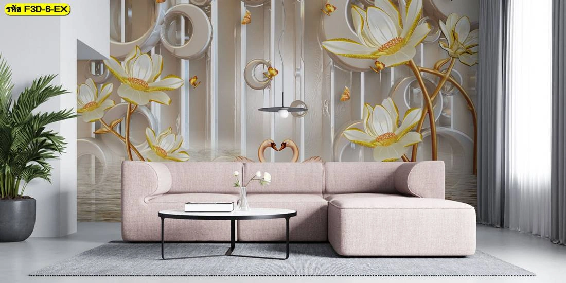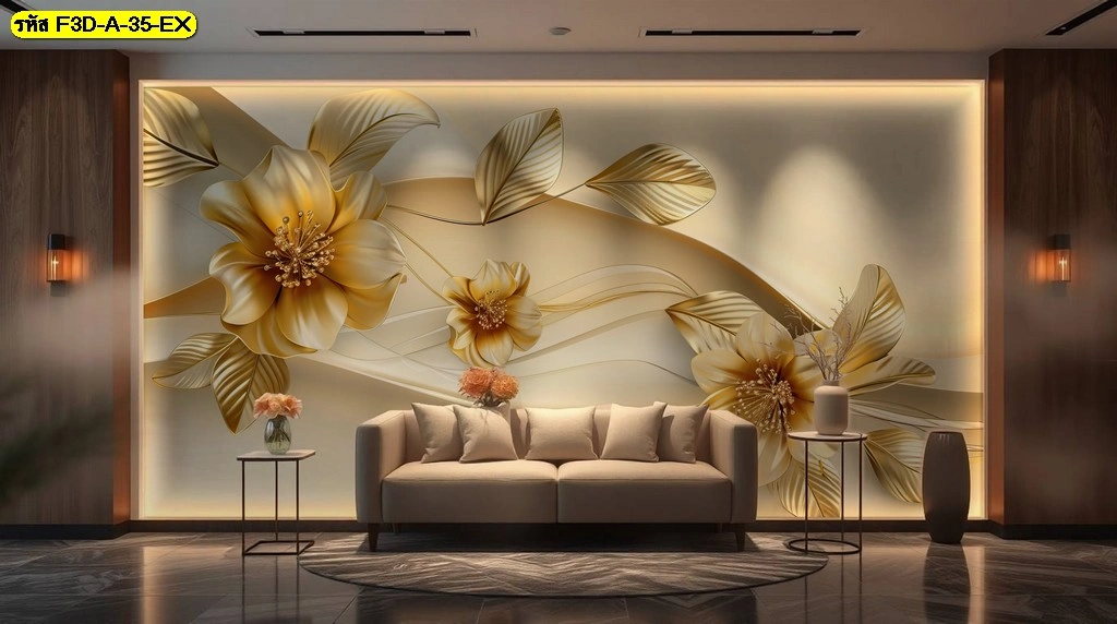 ผนังห้องรับแขกในภาพแรกใช้วอลเปเปอร์ดอกไม้โทนทองครีมขนาดเต็มผนัง สร้างบรรยากาศโมเดิร์นลักชัวรีให้บ้านและคอนโดได้ทันที เหมาะกับโซฟาโทนอบอุ่นและไฟแสงนวล ช่วยให้การต้อนรับแขกดูมีระดับขึ้นอย่างชัดเจน วัสดุสามารถเลือกเป็นภาพพิมพ์ผ้าแคนวาสหน้ากว้าง 300 ซม. ไร้รอยต่อ เพื่อให้ลายดอกไม้ไหลต่อเนื่อง หรือเลือกใช้สติ๊กเกอร์ 3M ติดกระจกในกรณีที่ผนังเป็นช่องกระจกยาว ทำให้ได้อารมณ์หรูอบอุ่นต่อเนื่องตั้งแต่ประตูทางเข้าจนถึงโซฟาหลัก