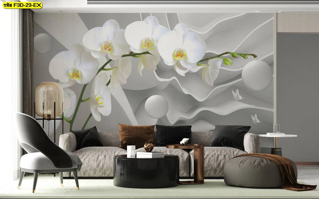 วอลเปเปอร์ลายดอกไม้ในห้องรับแขกสไตล์โมเดิร์น ทำให้ห้องดูกว้างหรูและสว่าง เหมาะกับบ้านและคอนโดที่ต้องการผนังจุดเด่นเรียบสะอาดตา