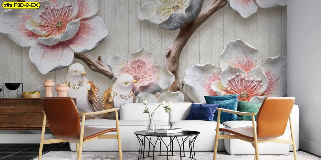 วอลเปเปอร์ห้องรับแขกลายดอกไม้ 3D สีชมพูบนพื้นผิวไม้คู่กับนกตกแต่งหน้าโซฟา ช่วยสร้างบรรยากาศหรูอบอุ่นสไตล์โมเดิร์นสำหรับเจ้าของบ้านและคอนโดที่ต้องการผนังเด่นเป็นจุดโฟกัสหลัก