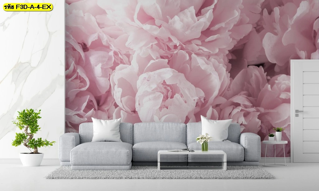 แต่งห้องรับแขกคอนโดให้หวานละมุนด้วยภาพดอกไม้ชมพูเต็มผนัง