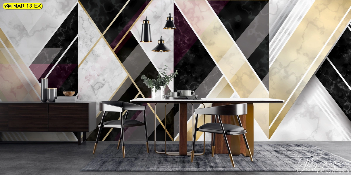วอลเปเปอร์หินอ่อน Geometric Art ดีไซน์รูปทรงเรขาคณิต สีดำ ทอง ม่วง ขาวโดดเด่น สร้างอารมณ์โมเดิร์นลักชัวรีให้กับห้องทานข้าวหรือโชว์รูมมุมพิเศษ