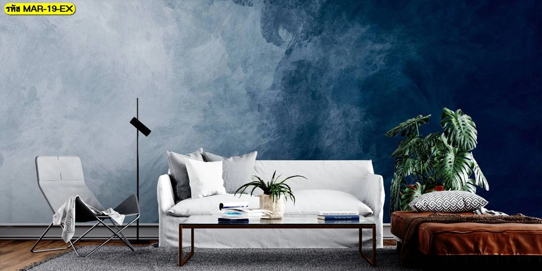 ห้องนั่งเล่นสไตล์โมเดิร์นเรียบง่าย แต่งผนังด้วยศิลปะวอลเปเปอร์โทนฟ้าน้ำเงิน เหมาะกับงานรีโนเวทและสำนักงานที่เน้นความสงบและทันสมัย สร้าง Mood ให้ลูกค้ารู้สึกผ่อนคลาย รับกับแนวคิดของนักออกแบบและธุรกิจอสังหาริมทรัพย์ เน้นดีไซน์ที่ตอบสนองไลฟ์สไตล์ความพรีเมียม