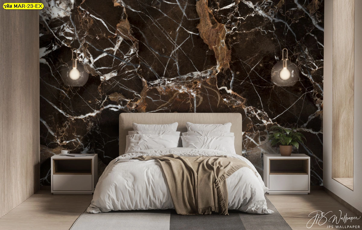 วอลเปเปอร์ลายหินอ่อน สีดำน้ำตาล ติดผนังห้องนอนธุรกิจอสังหาริมทรัพย์ เพิ่มความหรูดูพรีเมียม