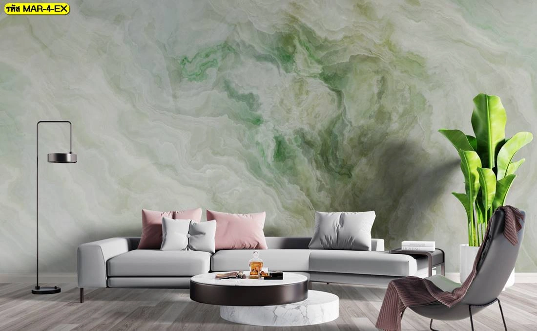 วอลเปเปอร์ลายหินอ่อน โทนเขียวอ่อน ให้ความรู้สึกสดชื่นและเป็นธรรมชาติ เหมาะสำหรับตกแต่งห้องรับรองแขกหรือพื้นที่นั่งเล่นในงานรีโนเวทโครงการอสังหาริมทรัพย์