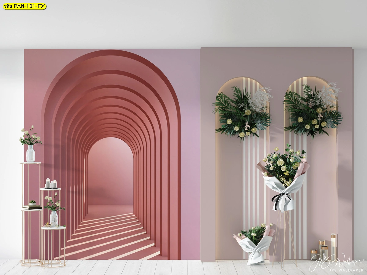 ภาพติดผนังลายซุ้มโค้งมิติสีชมพูพาสเทล ไล่ระดับแสงเงาช่วยสร้างมิติลวงตาให้ห้องดูยาวขึ้น เหมาะสำหรับมุมถ่ายรูปในคาเฟ่หรือห้องนั่งเล่นสไตล์หวานทันสมัย