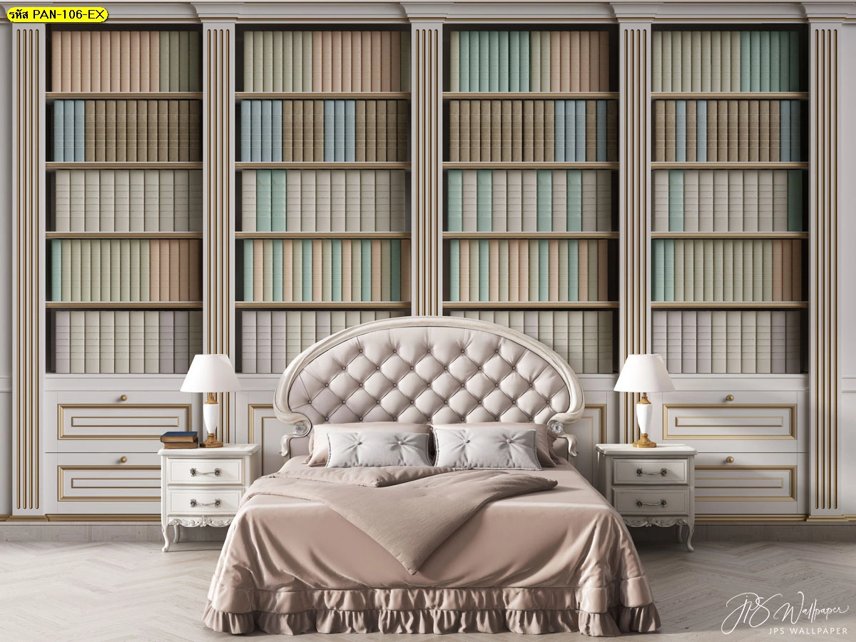 วอลเปเปอร์ลายชั้นหนังสือวินเทจสีขาวครีม ตกแต่งหัวเตียงห้องนอนสไตล์คลาสสิก ช่วยสร้างบรรยากาศแห่งการเรียนรู้ที่ดูสะอาดตา สว่าง และผ่อนคลายสำหรับการพักผ่อน