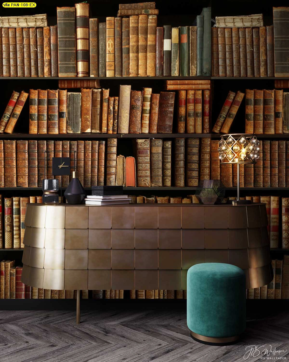 วอลเปเปอร์ลายห้องสมุดหนังสือเก่าปกหนังโทนสีเข้ม สร้างบรรยากาศขรึมขลังและมีเสน่ห์แบบย้อนยุค เหมาะสำหรับตกแต่งห้องทำงานผู้บริหารหรือมุมอ่านหนังสือส่วนตัว