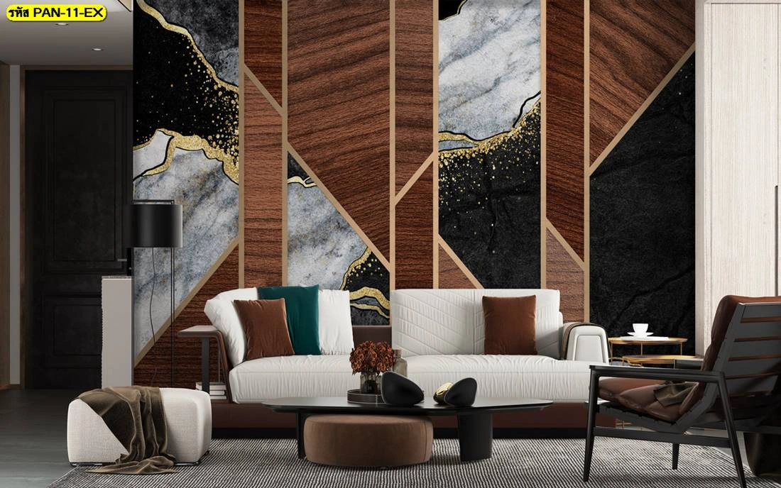 วอลเปเปอร์ติดผนังห้องนั่งเล่นลายกราฟิกเรขาคณิต ผสมผสานลวดลายหินอ่อนตัดขอบทองและลายไม้ธรรมชาติ มอบความรู้สึกโมเดิร์นลักซ์ชูรี่ที่ดูอบอุ่นและทันสมัยในเวลาเดียวกัน