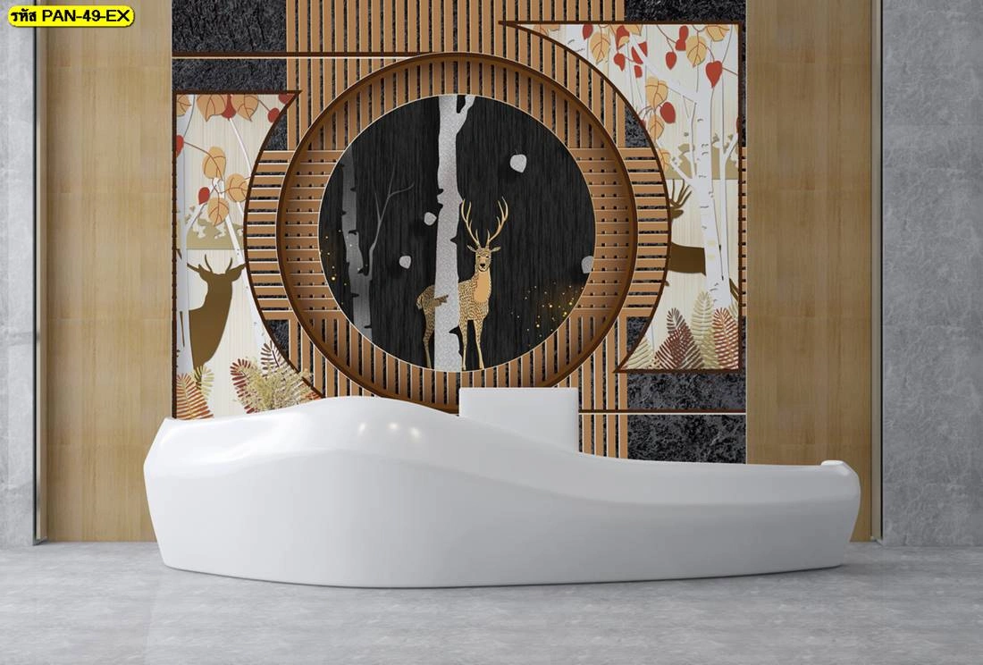 ภาพกราฟิกตกแต่งเคาน์เตอร์ต้อนรับลายกวางในป่าสนยามค่ำคืน ดีไซน์วงกลมซ้อนไม้ระแนง ให้ความรู้สึกต้อนรับที่อบอุ่นและใกล้ชิดธรรมชาติอย่างมีศิลปะ
