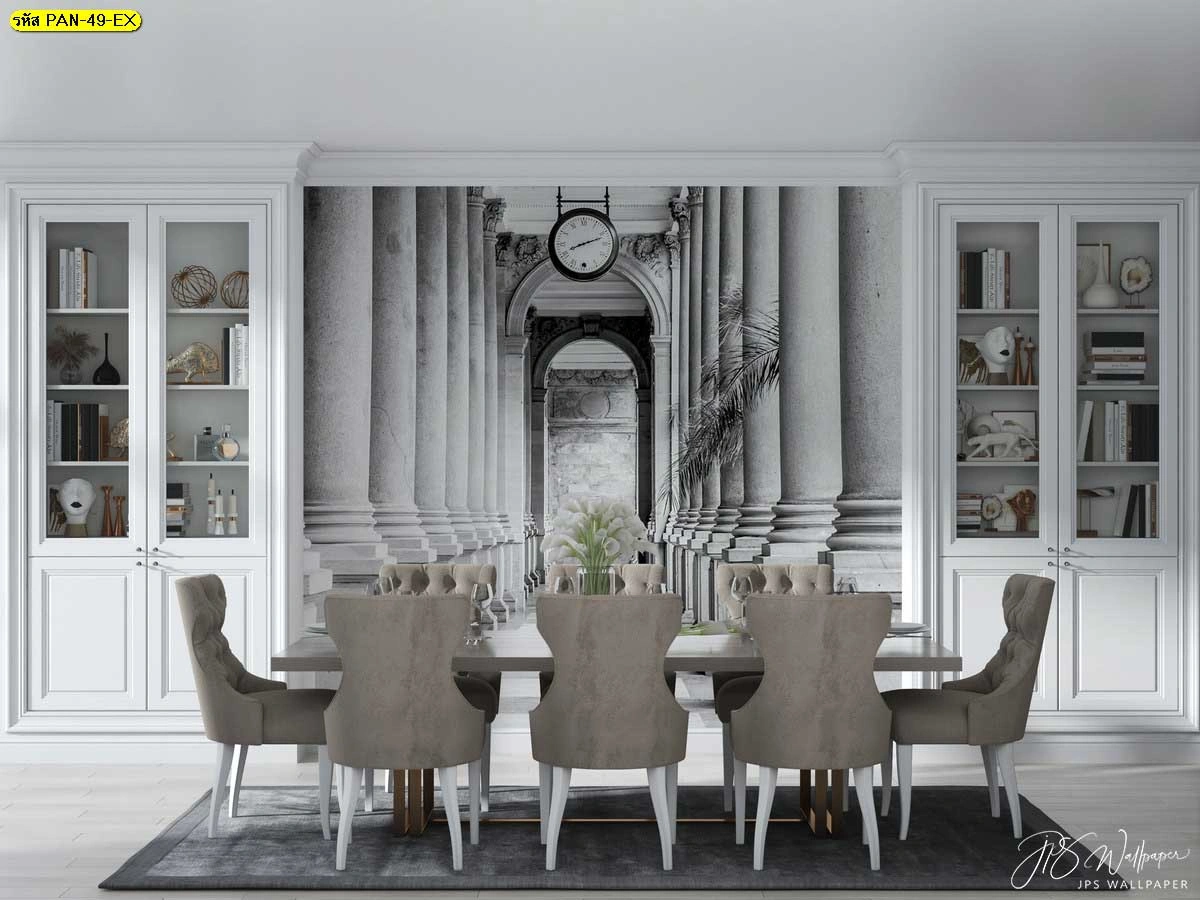 ไอเดียตกแต่งห้องทานอาหารด้วยวอลเปเปอร์ลายสถาปัตยกรรมโรมันคลาสสิก ภาพซุ้มประตูมิติสีขาวดำช่วยเพิ่มความลึกให้ห้องดูโอ่อ่าหรูหราและกว้างขวางขึ้นอย่างมีระดับ