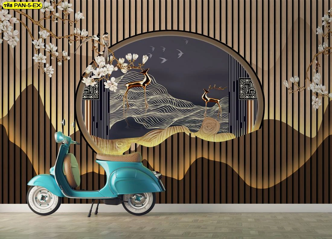วอลเปเปอร์ลายเส้นแนวตั้งสีดำทองประดับภาพกวางและดอกไม้สไตล์โอเรียนทอลโมเดิร์น เสริมฮวงจุ้ยและความมั่งคั่ง เหมาะสำหรับตกแต่งผนังโชว์ให้ดูโดดเด่นสะดุดตา
