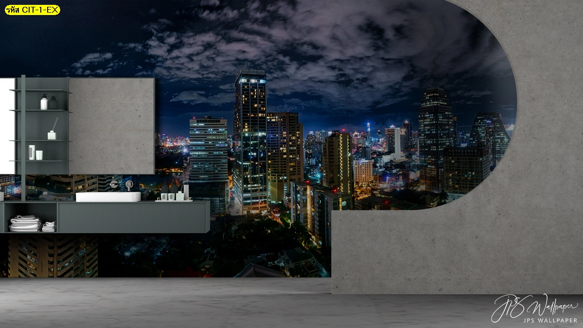 แต่งห้องน้ำโมเดิร์นสไตล์ลอฟท์ วอลเปเปอร์วิวตึกเมืองใหญ่ ยามค่ำคืนสีน้ำเงิน-เทา ตกแต่งเข้ากับบิ้วท์อินปูนเปลือยสีเทาเข้ม