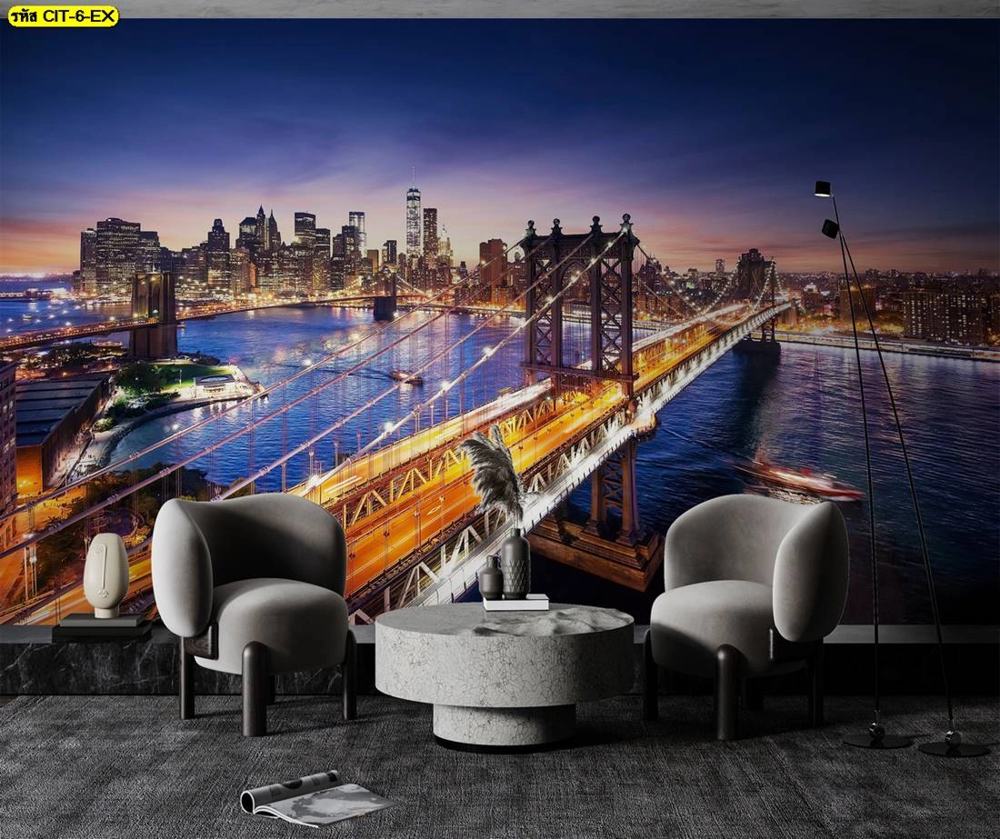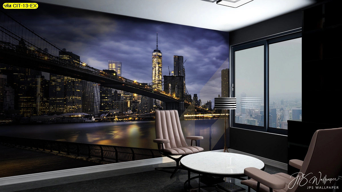 - วอลเปเปอร์วิวตึกเมืองใหญ่ ภาพสะพานเหล็กที่มีแสงไฟสีส้มอบอุ่นตัดกับท้องฟ้าสีน้ำเงินเข้ม สร้างความตัดกันที่สวยงาม เหมาะสำหรับคนวัยทำงานที่ต้องการพื้นที่ที่ดูหรูหรา มีสไตล์ และแสดงถึงความชื่นชอบในสถาปัตยกรรมและการออกแบบสมัยใหม่ การจัดเฟอร์นิเจอร์สีเทา-ดำช่วยให้ภาพโดดเด่นมากยิ่งขึ้น โต๊ะหินอ่อนเพิ่มความหรูหรา ทำให้ห้องดูมีคลาสและระดับ