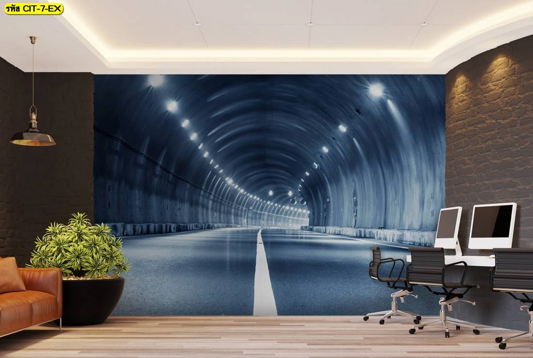 วอลเปเปอร์ห้องทำงานแนวอุโมงค์สไตล์ฟิวเจอร์ โทนสีน้ำเงิน-เทาเงิน สร้างมิติความลึก ตกแต่งด้วยโต๊ะทำงานดำและเก้าอี้หนังสีน้ำตาล