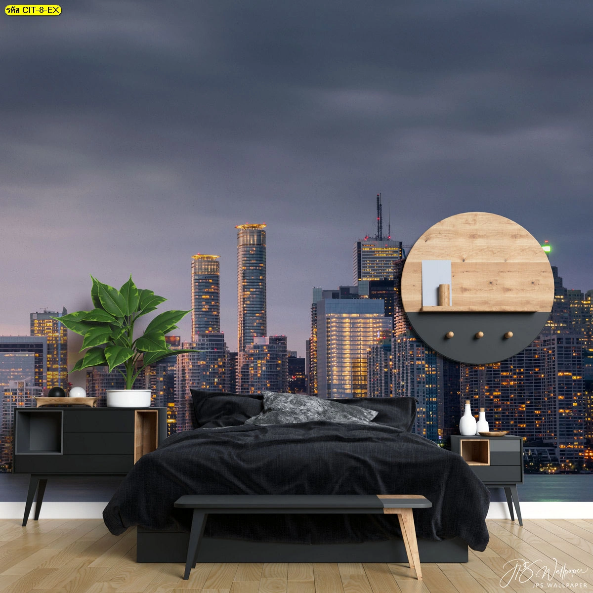 วอลเปเปอร์ห้องนอนโมเดิร์นภาพวิวเมืองใหญ่ยามค่ำคืน ตกแต่งด้วยเตียงสีเทาดำ โต๊ะข้างเตียงไม้โอ๊ค และต้นไม้ประดับสร้างบรรยากาศอบอุ่น