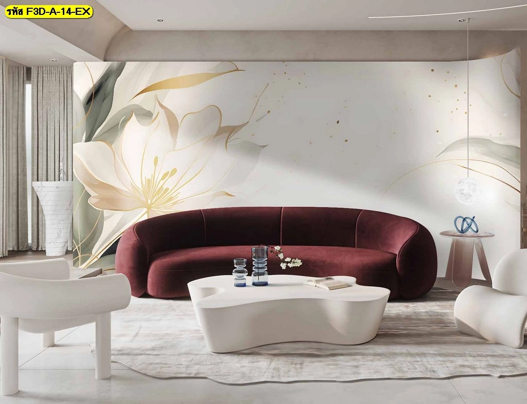 วอลเปเปอร์ลายดอกไม้เส้นทองขนาดใหญ่ เน้นดีไซน์กลมกลืน เหมาะกับห้องรับแขกของบ้านสไตล์โมเดิร์น เพิ่มพื้นที่ใช้งานให้ดูมีมิติ สบายตา และช่วยส่งเสริมบรรยากาศให้หรูหรา เหมาะกับการเป็น Accent Wall ที่ดึงความสนใจได้ดี