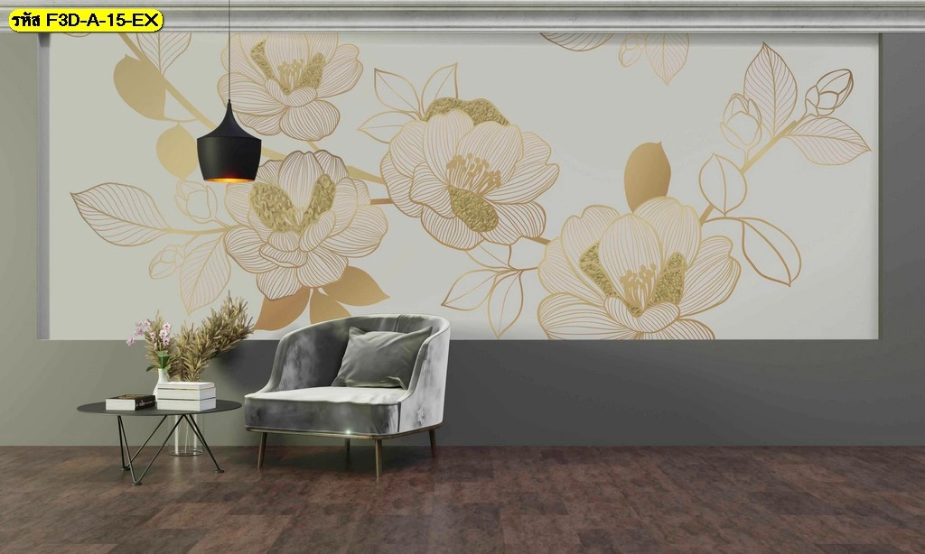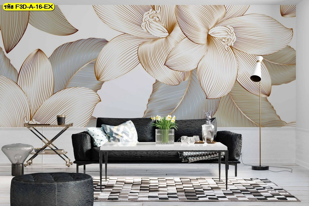 วอลเปเปอร์ภาพดอกไม้เส้นทองขนาดใหญ่ ออกแบบเพื่อห้องรับแขกทันสมัยเน้นความหรู ดูดีและถ่ายรูปสวย​