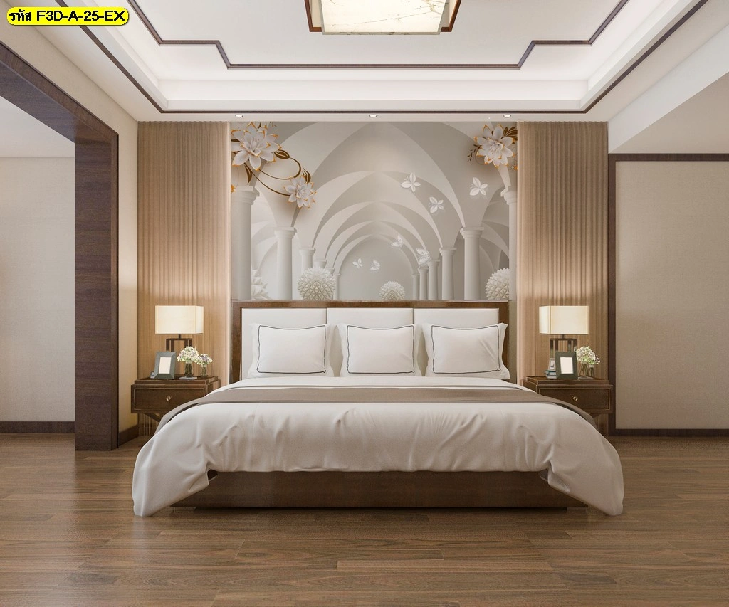 วอลเปเปอร์ภาพศิลปะดอกไม้ขาวทองและลวดลายโค้ง 3 มิติ เหมาะกับห้องนอนสไตล์โมเดิร์น ช่วยขยายมิติของพื้นที่ โปร่งโล่ง ดูมีระดับ เสริมบรรยากาศให้ห้องให้โดดเด่นและอบอุ่นทันสมัย