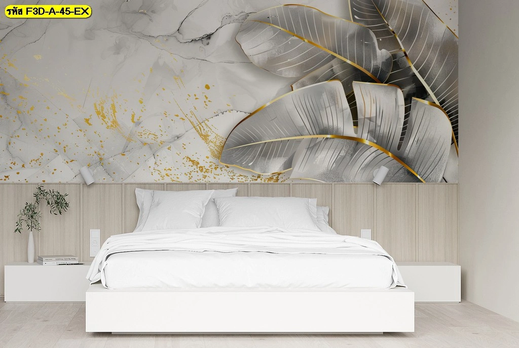 วอลเปเปอร์ภาพใบไม้ใหญ่โทนเทาทอง ออกแบบในสไตล์โมเดิร์นบนผนังหัวเตียงห้องนอน ช่วยสร้างจุดนำสายตาให้ห้องดูโปร่งกว้าง พร้อมรายละเอียดพื้นผิวเสริมความหรูหราแก่พื้นที่อย่างลงตัว