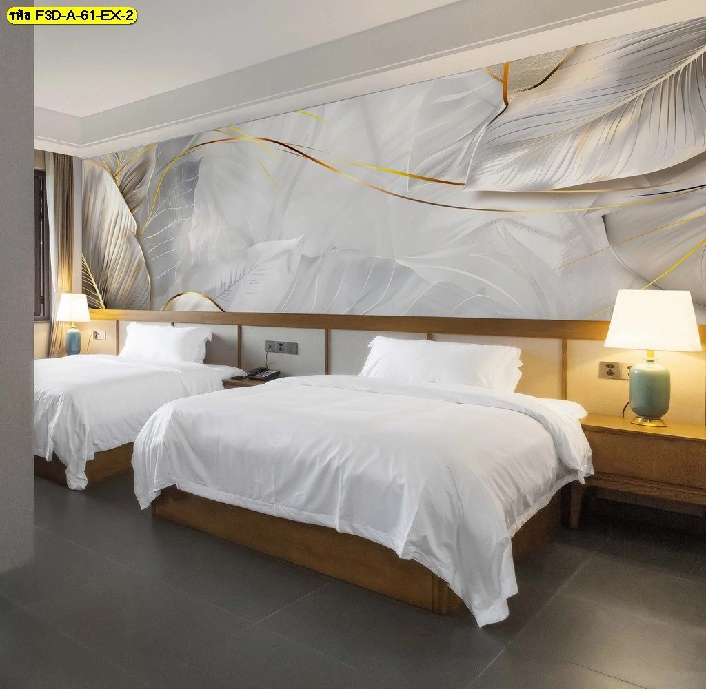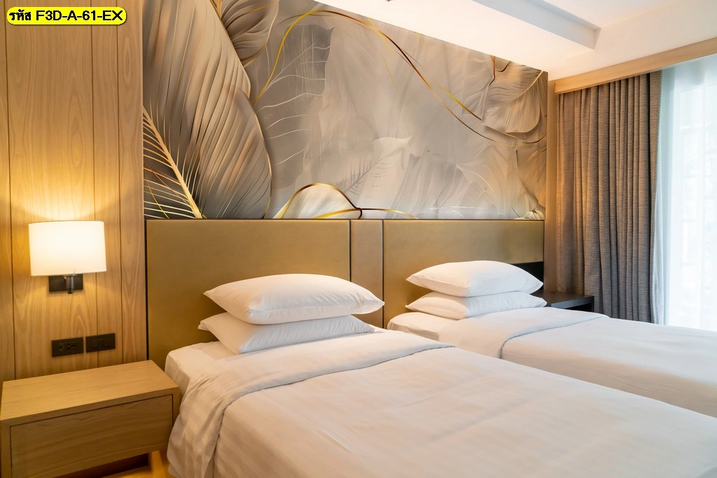 วอลเปเปอร์ลายใบสีขาวเทาทอง ติดหัวเตียงห้องนอนสไตล์โมเดิร์น ดีไซน์เน้นเส้นสายคลีนและแสงธรรมชาติ ช่วยขับให้ห้องนอนดูหรูหราและผ่อนคลาย เหมาะกับบ้านและโรงแรมที่ต้องการจุดเด่นบนผนัง