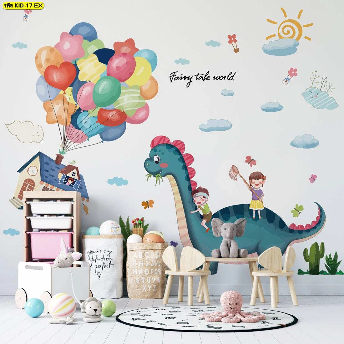 วอลเปเปอร์แต่งห้องเด็ก ลายไดโนเสาร์และบ้านลูกโป่งสีสดใส เหมาะสำหรับตกแต่งโซนกิจกรรม STEAM ในบ้านช่วยให้ห้องเรียนรู้เด็กดูสนุกและมีจินตนาการมากขึ้น