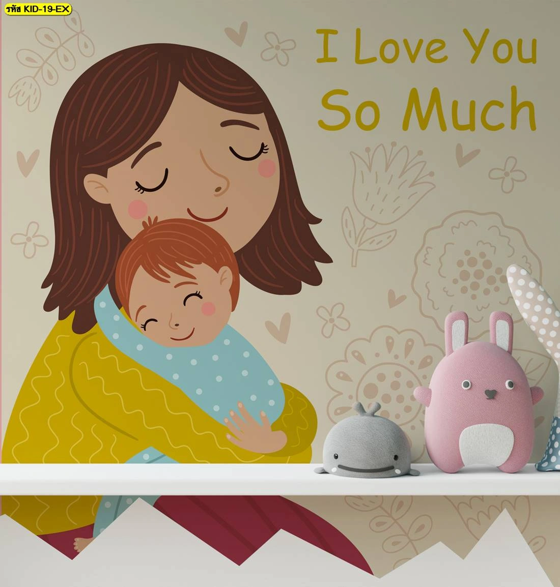 ภาพศิลปะแม่ลูกกอดกันบนพื้นหลังโทนอุ่น สำหรับวอลเปเปอร์ตกแต่งห้องเด็ก หรือมุมดูแลเด็กเล็ก ช่วยสื่อถึงความรัก ความผูกพัน และบรรยากาศอบอุ่นในบ้าน