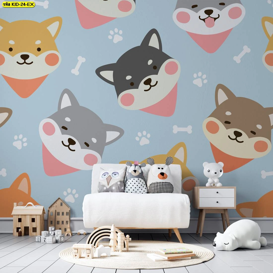 วอลเปเปอร์แต่งห้องเด็ก ลายสัตว์หัวสุนัขชิบะโทนพาสเทลน่ารัก เหมาะสำหรับห้องนอนเด็กและมุมอ่านนิทานในบ้าน ช่วยสร้างความอบอุ่นผ่อนคลายให้พื้นที่เล่นและเรียนรู้