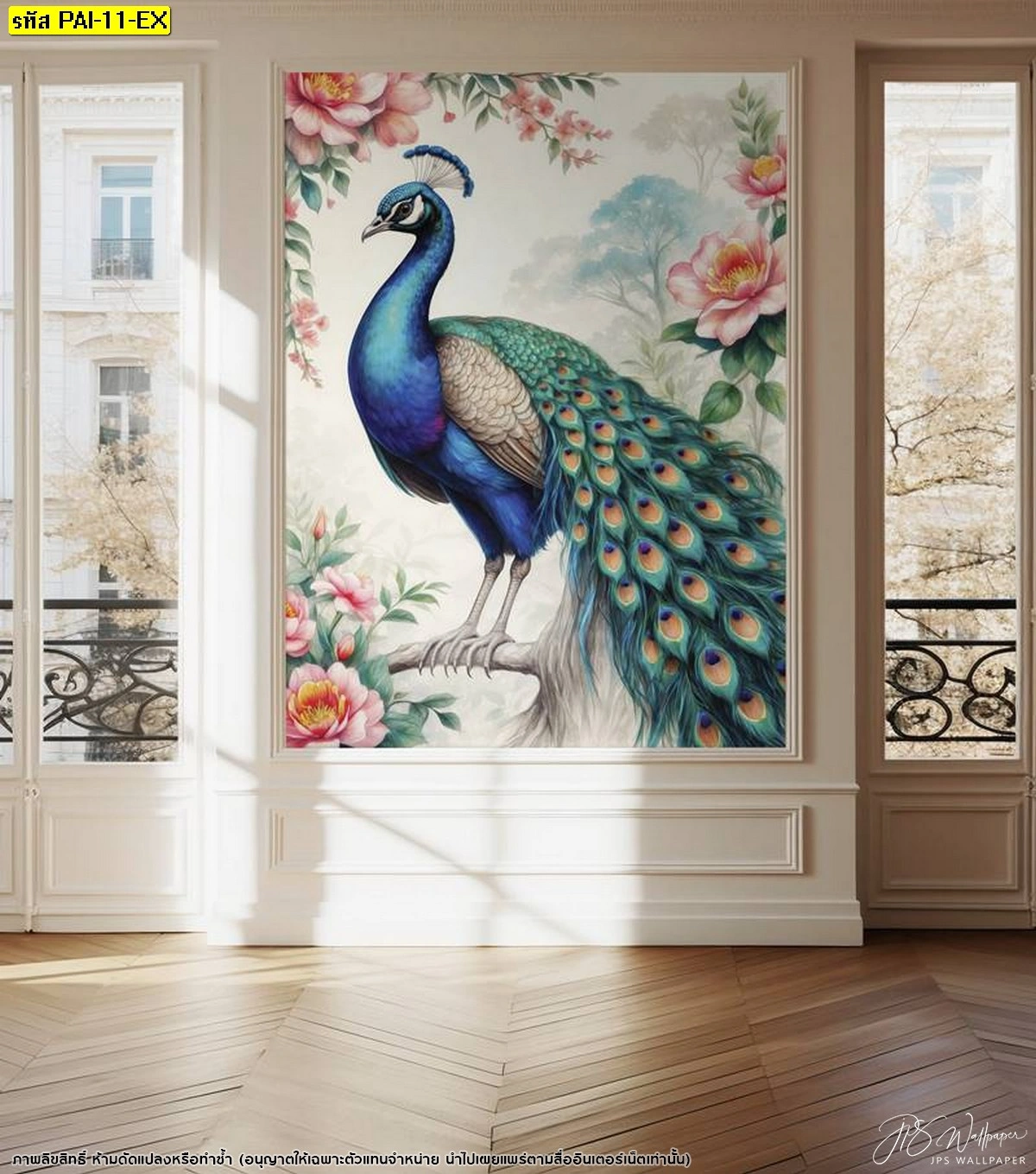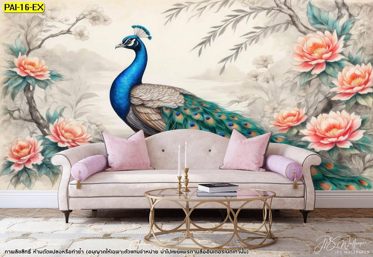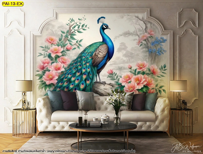 วอลเปเปอร์สั่งทำลายนกยูงสีฟ้าสดใสยืนโดดเด่นตัดกับพื้นหลังสีขาวนวลและดอกไม้สีชมพูอ่อนช่วยให้ห้องดูกว้างขึ้นและสบายตาเหมาะกับบ้านทุกสไตล์