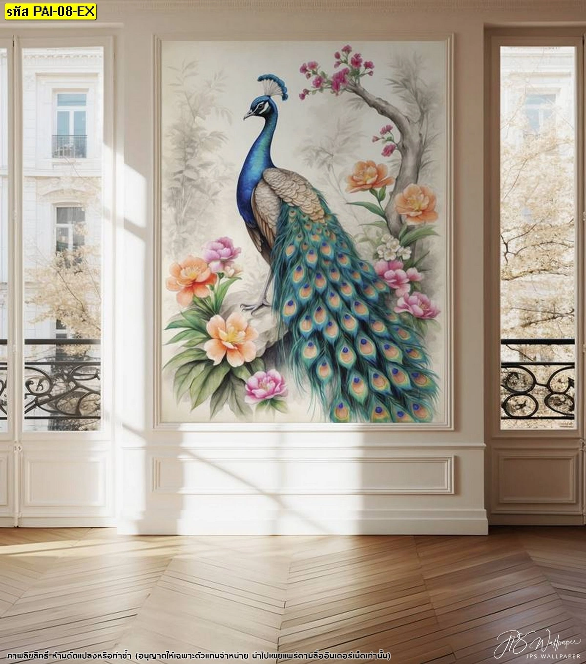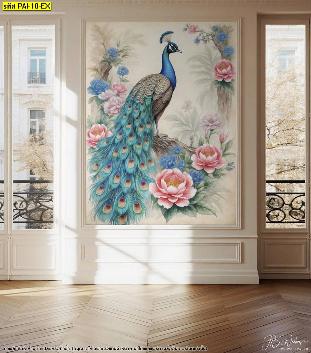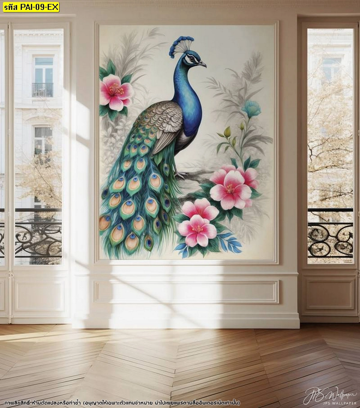 วอลเปเปอร์สั่งทำลายนกยูงสีฟ้าสดใสยืนโดดเด่นตัดกับพื้นหลังสีขาวนวลและดอกไม้สีชมพูอ่อนช่วยให้ห้องดูกว้างขึ้นและสบายตาเหมาะกับบ้านทุกสไตล์