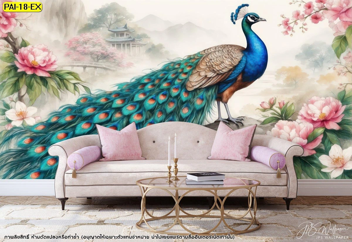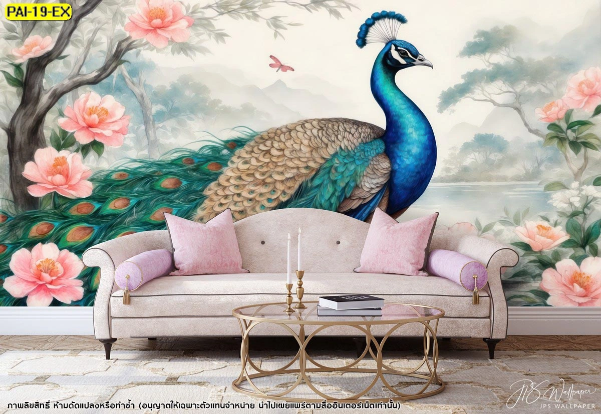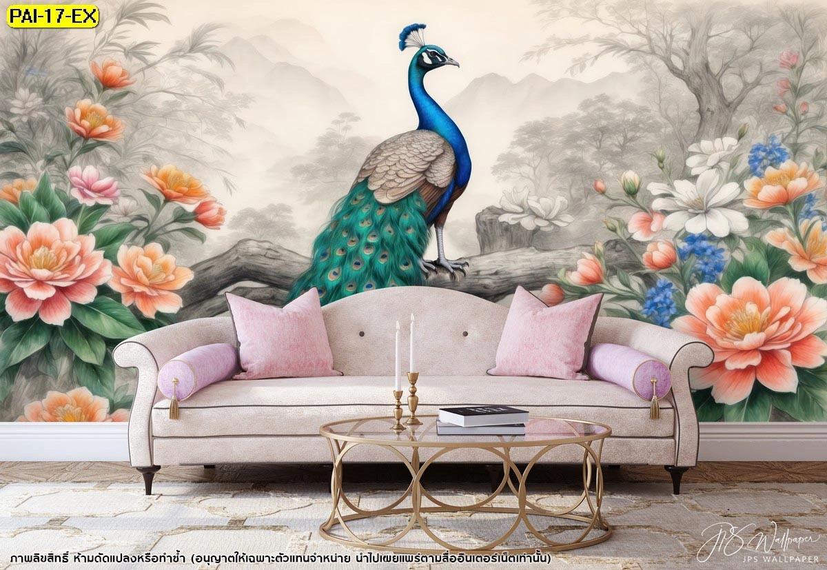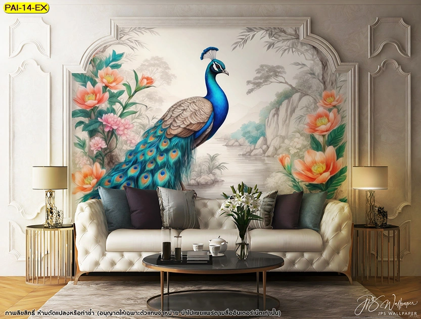 ตกแต่งห้องนั่งเล่นด้วยวอลเปเปอร์นกยูงสีสดใสท่ามกลางพุ่มดอกไม้สีพีชเสริมความรักและความอบอุ่นให้กับสมาชิกทุกคนในครอบครัว