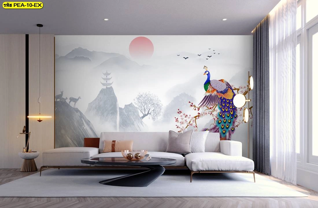 วอลเปเปอร์ลายนกยูงเสริมฮวงจุ้ยห้องนั่งเล่น ปรับพลังงานบวกเรียกทรัพย์ด้วยดีไซน์สุดล้ำ