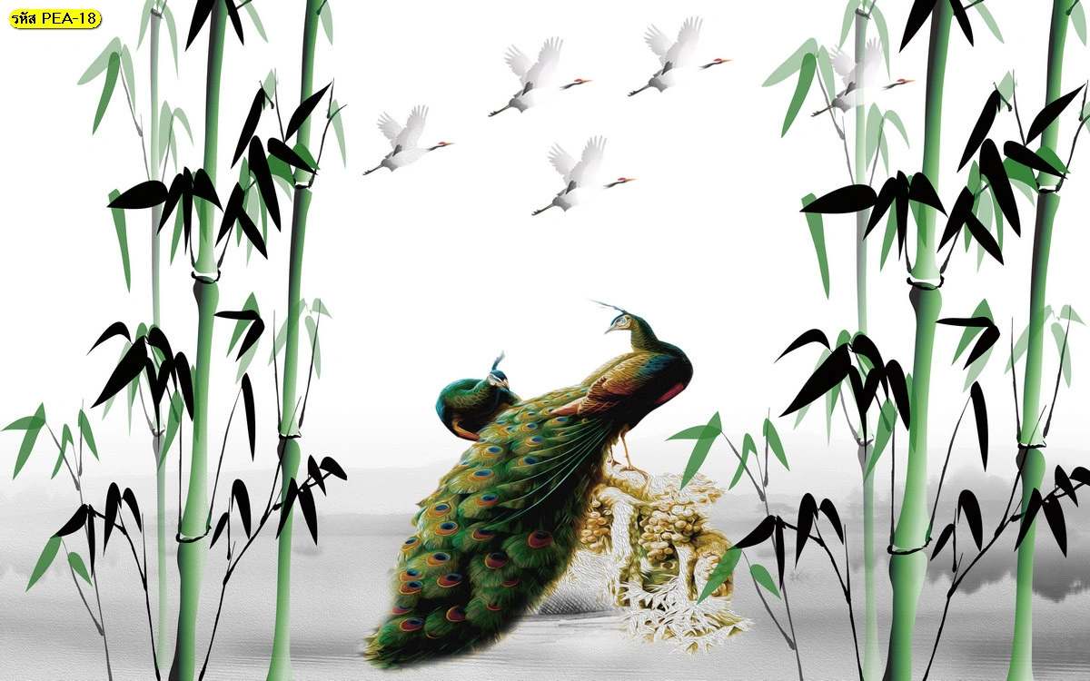 ภาพนกยูงสไตล์จีนมงคล ลายนกยูงคู่ท่ามกลางกอไผ่และนกกระเรียนช่วยเสริมให้อายุยืนยาวและกิจการเจริญรุ่งเรือง