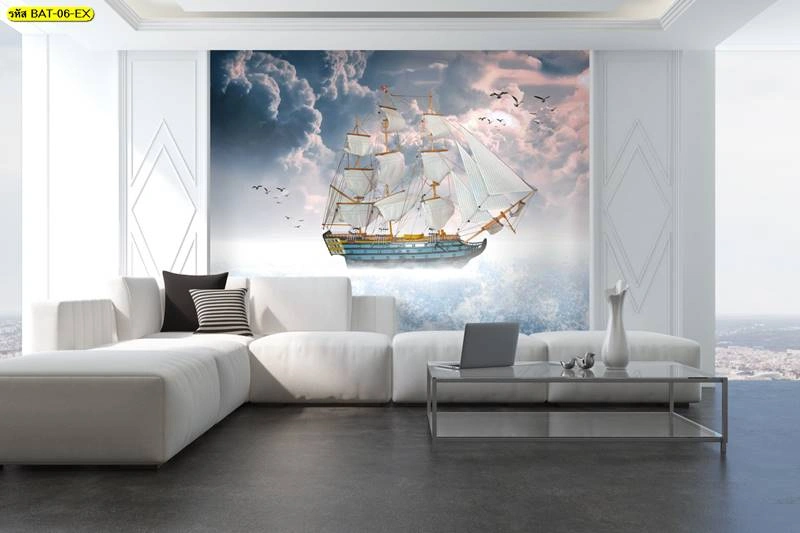 ภาพเรือสำเภาสีขาวสไตล์คลาสสิกแล่นท่ามกลางกลุ่มเมฆสีพาสเทล ให้ความรู้สึกนุ่มนวล สบายตา เหมาะสำหรับตกแต่งห้องนั่งเล่น