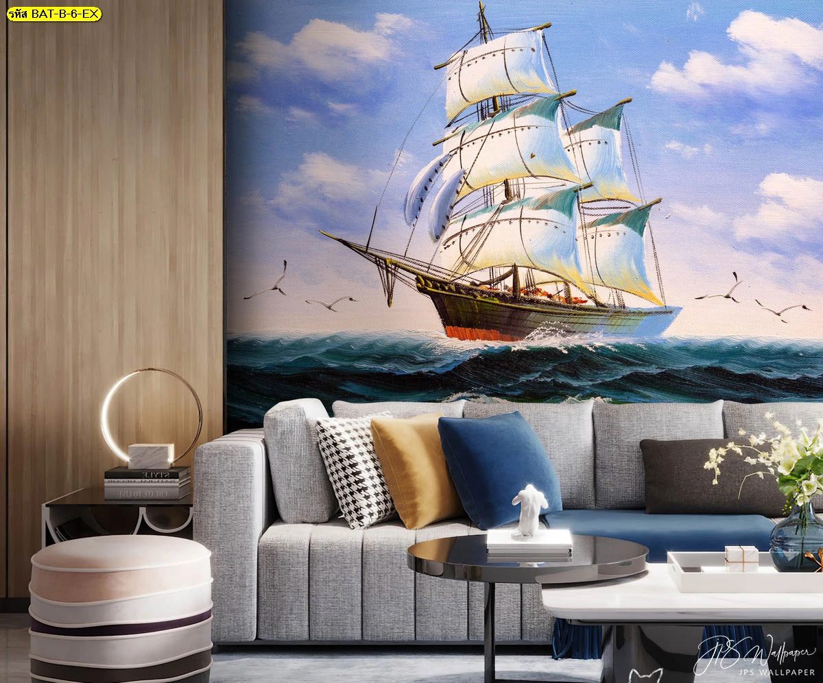 วอลเปเปอร์สั่งทำลายเรือใบกลางมหาสมุทร ท้องฟ้าสดใส ตกแต่งหลังโซฟาในห้องนั่งเล่นสไตล์โมเดิร์น ช่วยเปิดมุมมองให้ห้องดูกว้างขวาง สบายตา และผ่อนคลาย