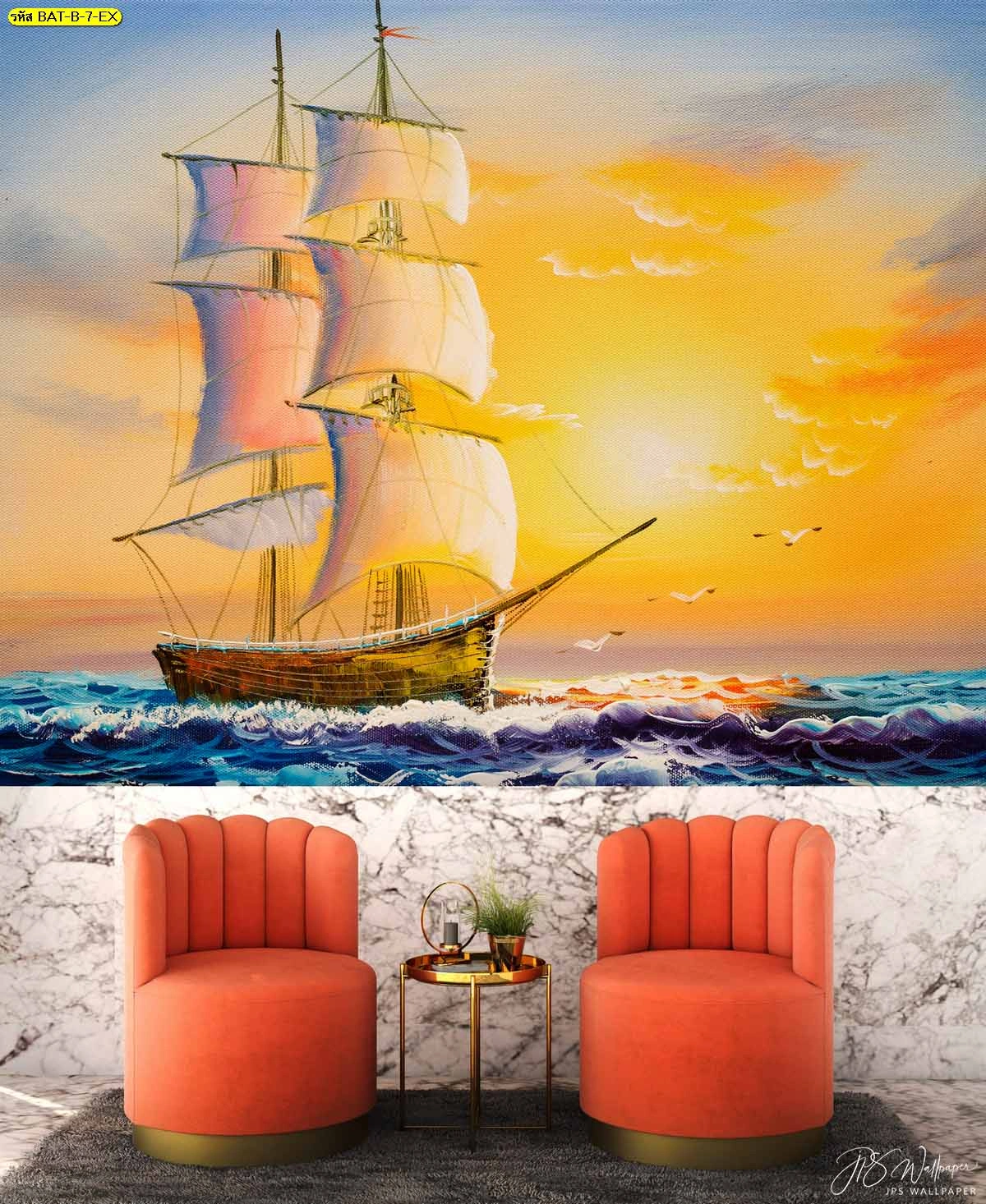 วอลเปเปอร์ลายภาพวาดเรือสำเภาแล่นในทะเลตอนพระอาทิตย์ตกดิน ท้องฟ้าสีทองส่องประกาย ตัดกับเก้าอี้กำมะหยี่สีส้มในห้องรับรองแขกสุดหรูเพื่อความมั่งคั่ง