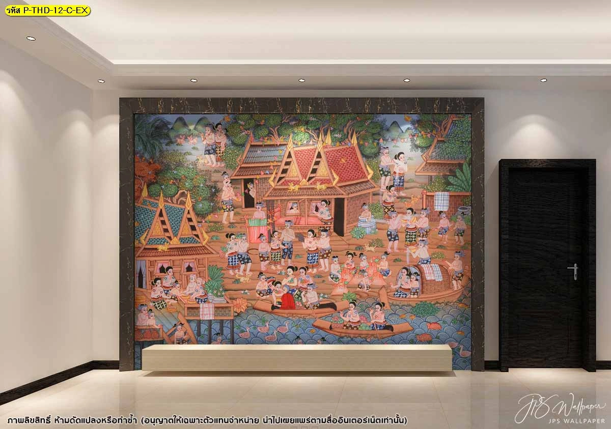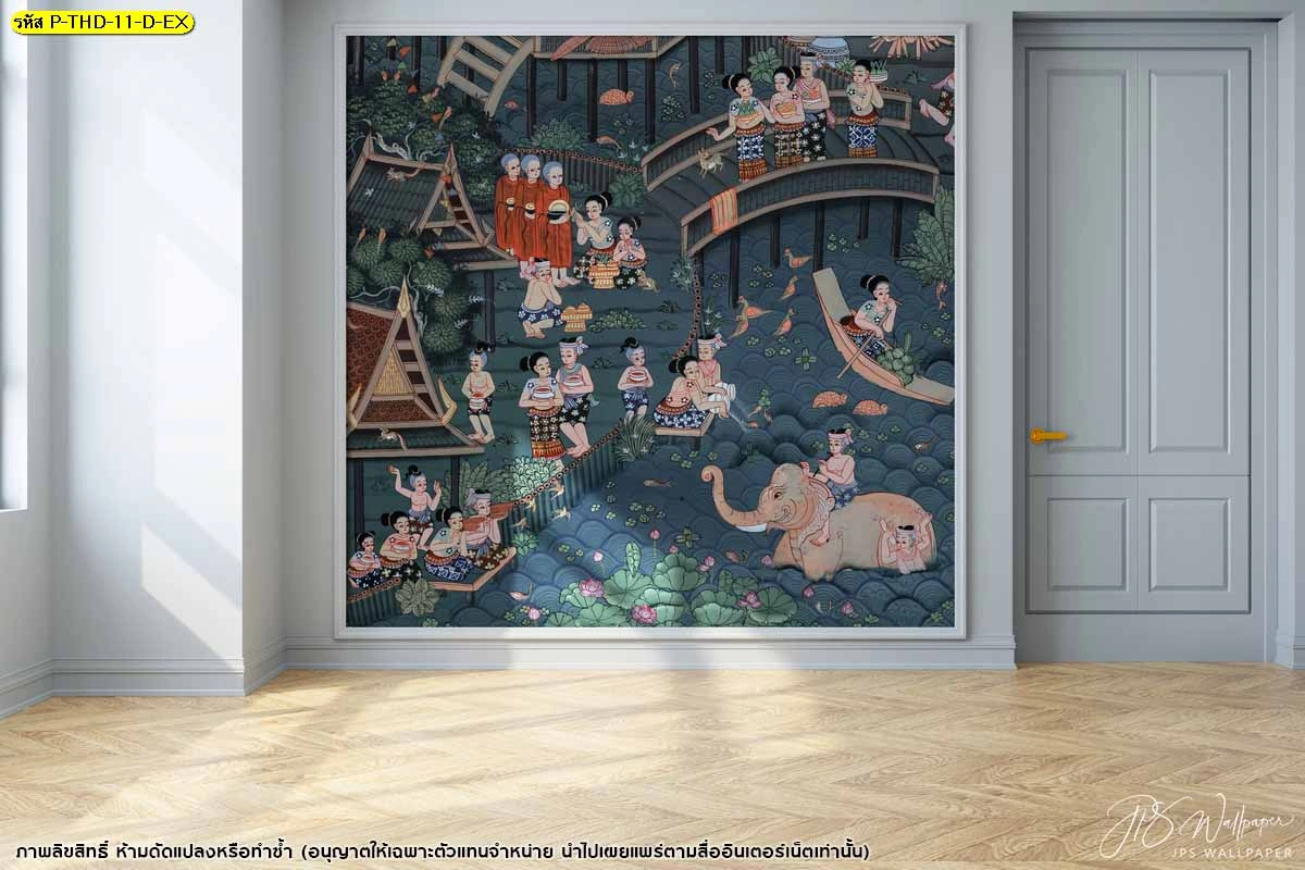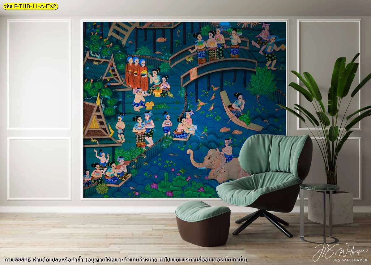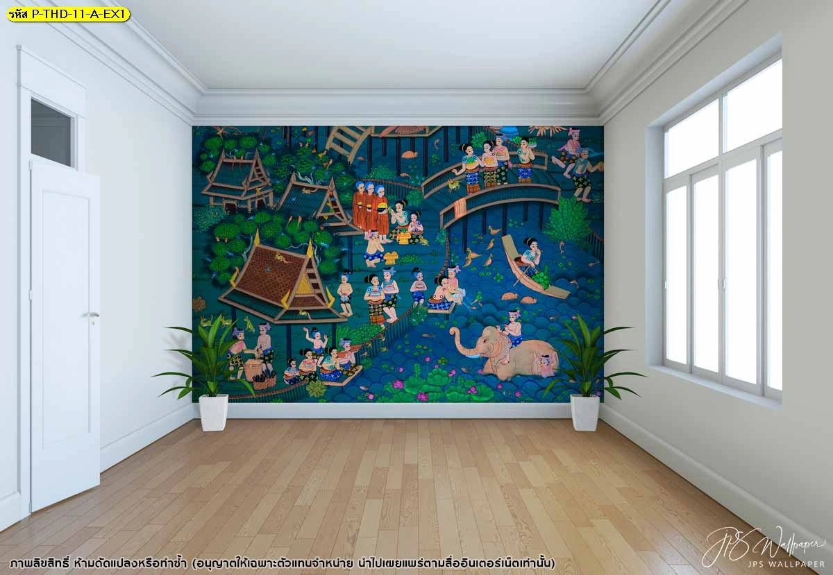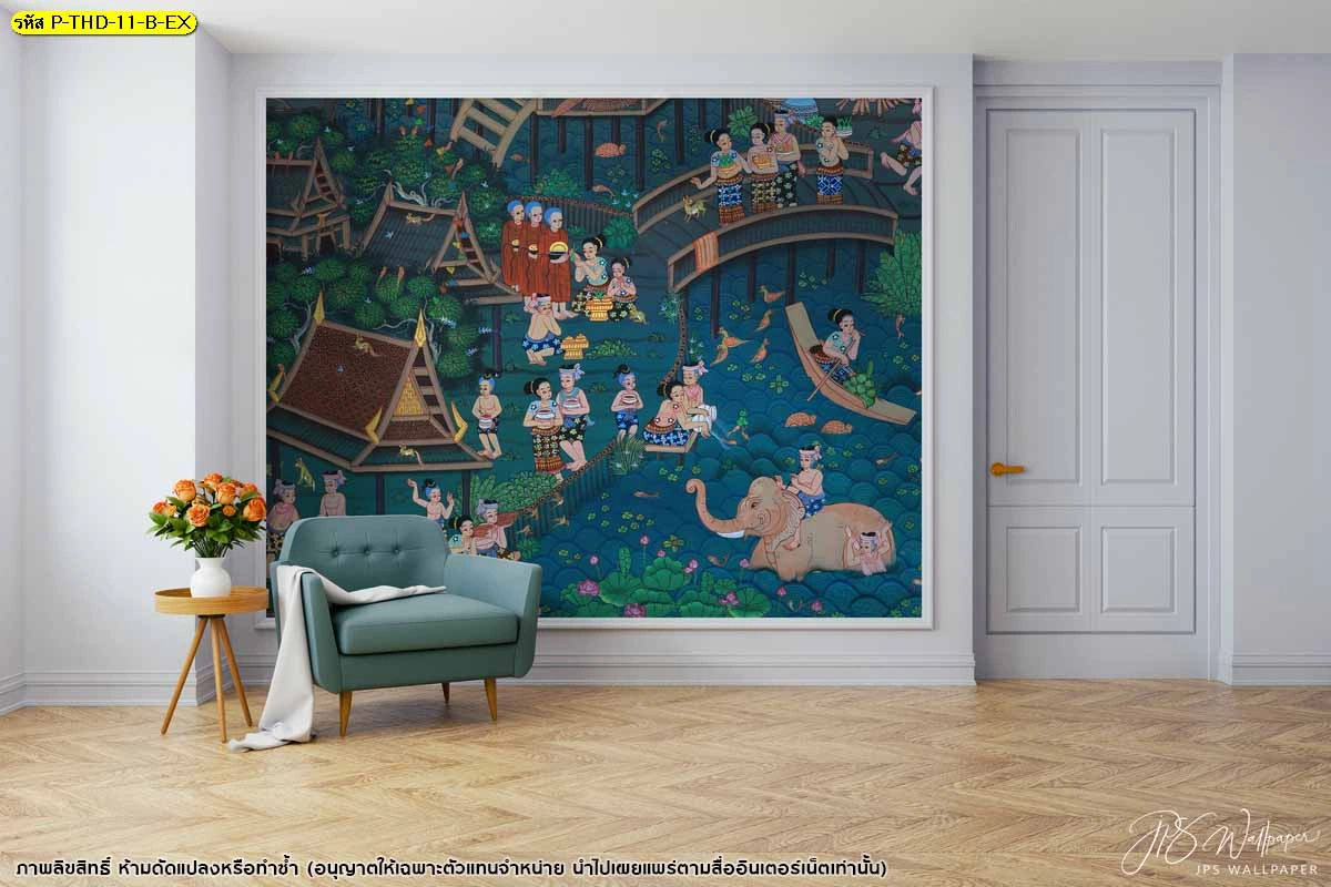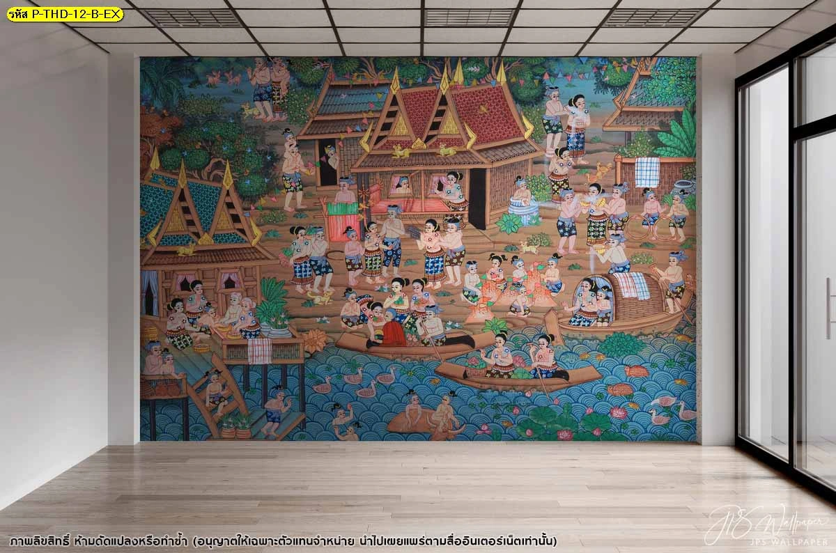 สั่งพิมพ์ภาพวาดวิถีชีวิตไทย ลายไทยบรรยากาศงานบุญสงกรานต์ขนาดใหญ่พิเศษสำหรับตกแต่งห้องรับแขกให้ดูโดดเด่นที่สุด