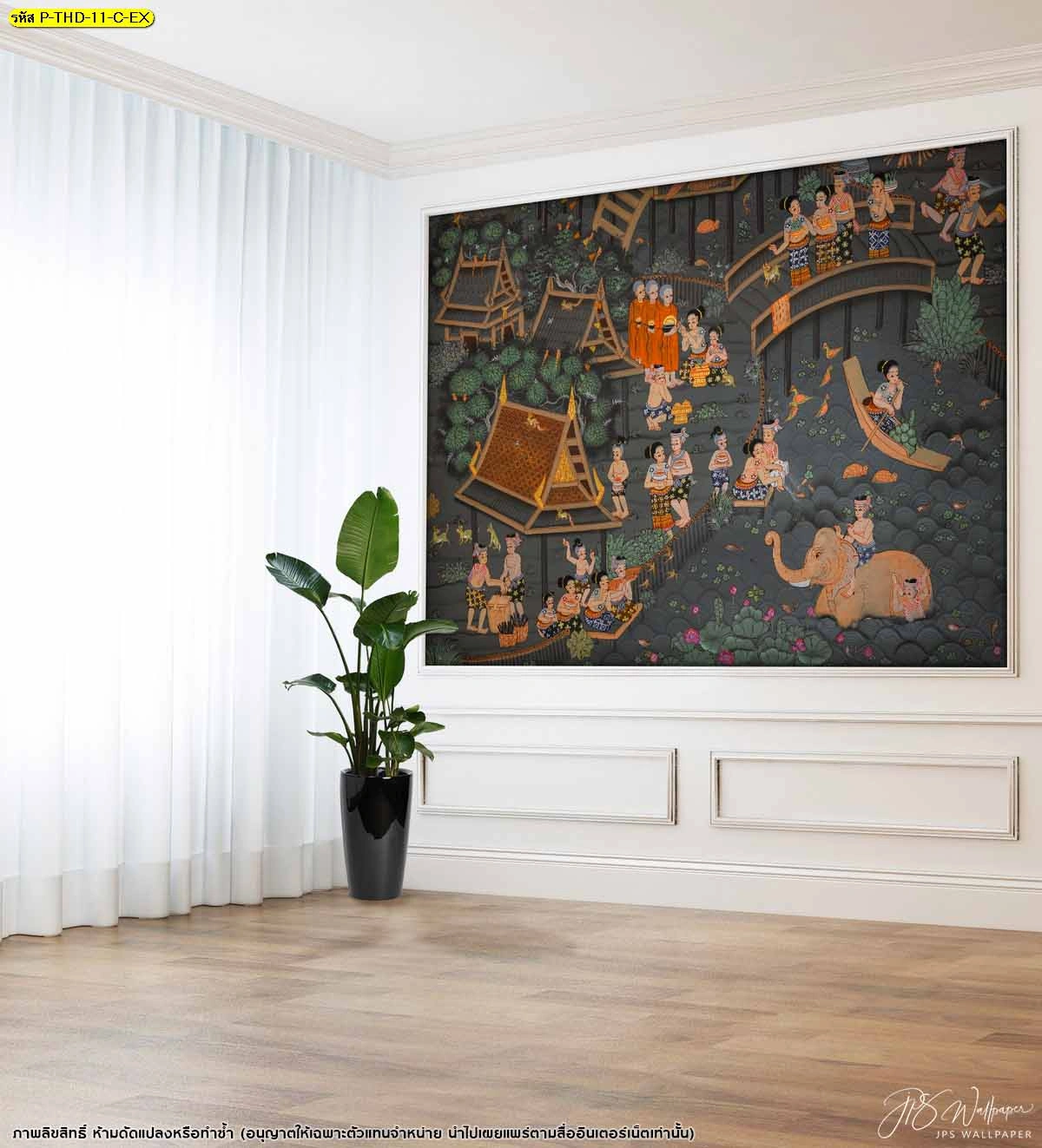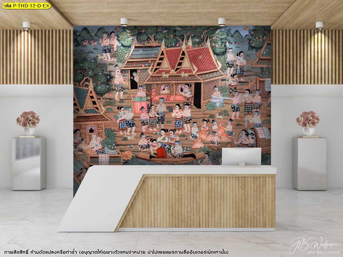 สำหรับกลุ่มลูกค้าที่พักอาศัยในคอนโดมิเนียมหรือบ้านสไตล์มินิมอล การใช้ ภาพลายไทยประยุกต์โทนสีโมเดิร์น จะช่วยลดความแข็งกระด้างของห้องสี่เหลี่ยมได้อย่างดีเยี่ยม ดังจะเห็นได้จากรูปภาพที่ลดทอนความจัดจ้านของสีดั้งเดิมมาเป็นโทนสีพาสเทล สีเทา หรือสีทองร่วมสมัย ทำให้วอลเปเปอร์ชุดนี้เข้ากับเฟอร์นิเจอร์สมัยใหม่ได้อย่างกลมกลืน เปลี่ยนผนังเรียบๆ ให้กลายเป็นงานศิลปะชิ้นเอกที่บอกเล่าวิถีชีวิตไทยได้อย่างร่วมสมัยและไม่ดูเก่าล้าสมัย นอกจากภาพบรรยากาศเทศกาลแล้ว ยังสามารถเพิ่มความน่าสนใจด้วยวอลเปเปอร์ลายพญาครุฑเพื่อให้ผนังดูมีมิติมากขึ้น